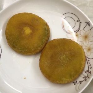 然后捏一点南瓜团,揉成圆在手掌压成饼状,再加入豆沙馅【馅看个人爱好加,例如:黑豆沙,白豆沙,芋泥……】然后再揉成光滑的圆圆,再在手掌压成这种饼状即可。
