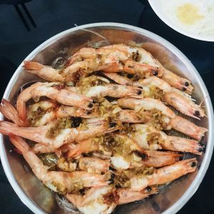 粉丝打底,上面铺一层虾,热油炒蒜,加入生抽,糖。炒熟后铺在虾身上。上锅蒸5分钟。