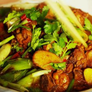 热锅凉油,下白砂糖,不停搅拌,直至糖变褐色起大泡,全部浮起,下鸡肉