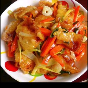 4 调汁。把醋和糖、玉米粉、鸡精、酱油倒入小碗,自己用手指尝尝味道,锅里放少量油,入配菜胡萝卜丝、葱丝、姜丝、蒜片、炒出香味后入汤汁,看到汤汁冒泡时入肉,迅速翻炒捞出。