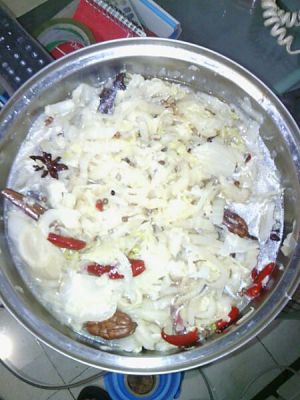 锅里加一碗水加入白糖,白醋,盐,烧滚,后浇到白菜上。