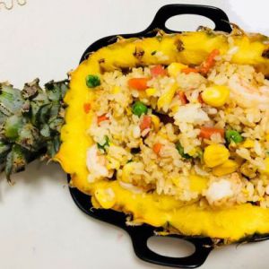 菠萝切去四分之一,四分之三留作菠萝碗,且将里面的菠萝肉切成小块取出,盐水泡浸20分钟后沥水备用~
