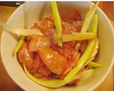 将鸡肉洗净,切小块,放在碗里,加入调料A腌制30分钟左右。(如果是鸡腿肉就去掉骨头先,我是勉强的去掉2个鸡腿的骨头)