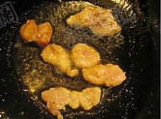 锅中倒油,将鸡肉一块一块的下入锅中炸,适当的搅动避免鸡块之间粘连,炸至金黄色就可以捞出了。