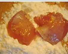 将腌制好的鸡肉块均匀的裹上一层淀粉。(据清风说红薯淀粉颗粒粗效果好,我因为要做蛋糕家里备了好多袋玉米淀粉,就将就了)