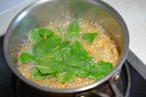 同时下入新鲜薄荷叶,炸到酥脆捞出