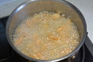 食用油烧到5成热,下入小河虾,炸到虾子变红,