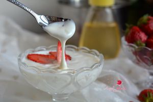 酸奶入冰箱冷藏数小时后,用干净的勺子取适量放在杯中,再根据口味将水果丁或者蜂蜜加入其中