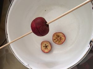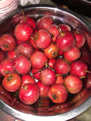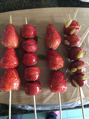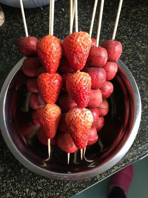 把山楂全部穿好 为了美观可以不把竹签穿出来。自己吃的就不用处理这些细节啦 有几个草莓 顺便也穿起来
