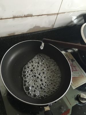 水越来越少 糖也稠了起来。有个简单方法检测糖稀是否可以。准备碗冷水,用一根筷子 沾一点糖液 浸到冷水里面几秒钟,拿出来凝结成水滴状就可以了。