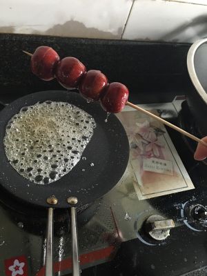 将糖葫芦在锅里糖液里滚一个圈 ,拿起来轻轻抖一下多余的糖液 ,放到刚才准备好的保险膜上冷却 。