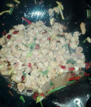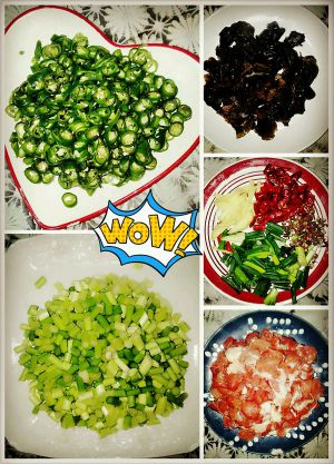 准备好所有入锅材料,牛肉切粒,蒜苔切粒,辣椒切粒,木耳切小块,葱段,姜丝,干辣椒,花椒,所有材料准备好后坐锅上油