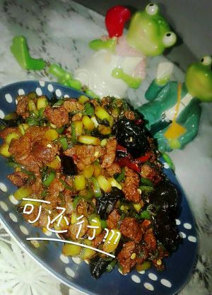 牛肉下锅后不断翻炒,直到把牛肉里面的油都炒干后放入适量味极鲜,盐,糖翻炒,然后下入蒜苔粒翻炒大概2-3分钟后放入木耳跟青椒粒翻炒,最后放入鸡精