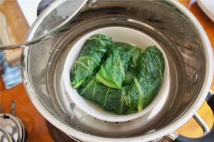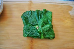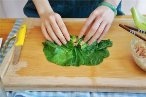 捞出一片菜叶,控干水分,将肉馅铺在开口上方两厘米处,肉馅成长条状,长度要看您蒸的容器大小。如图卷起第一道。