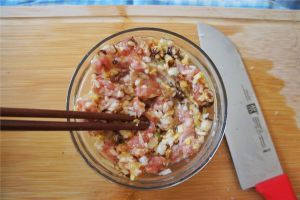 将香菇,荸荠,葱姜末,和白胡椒,料酒,蚝油,味极鲜,芝麻油,盐,鸡精加入肉馅,再放入半个蛋清(如果您的馅儿多,请酌情添加蛋清的量)一起搅打上劲。