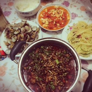 把肉切片,放入碗中倒入适量料酒.少量烟.干淀粉,抓匀后腌制十五分钟备用,大蒜切末,杭椒切圈,葱切丝,姜切丝,把麻椒跟干辣椒放在炒锅炒香,注意不要炒糊,炒香后辣椒切碎,切的碎一点口感好,也可以直接买辣椒面会比较方便,但我没试过我也不知道好不好吃,麻椒炒香后碾成麻椒面放一边