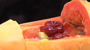 切掉木瓜的中间那一部分,用来做一个盖子,让整个木瓜看起来像只小船;然后把籽去掉。