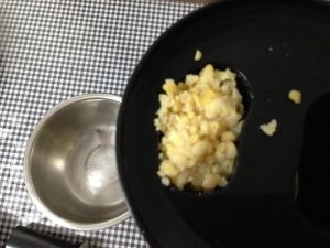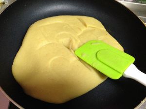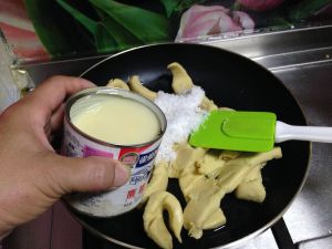 倒入不粘锅,加入玉米油、白糖、炼乳小火翻炒