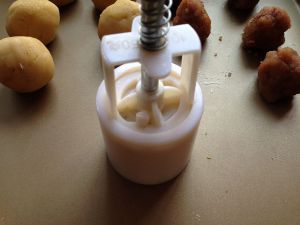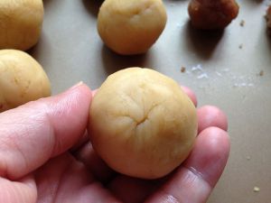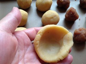 待豆沙不烫手时,原味豆沙分成30克一个搓圆,玫瑰豆沙分成20克一个的搓圆