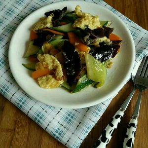 鸡蛋铲成块,留油下蒜瓣,倒入胡萝卜,黄瓜和木耳