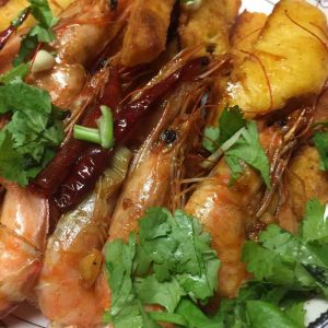 锅中放油,姜爆锅,油热后倒入虾,翻炒,虾变色后,放入蒜和干辣椒,翻炒后,放入少许盐,生抽,葱,糖,可以加入一些番茄酱,依据个人口味吧 加一勺水,这时可以把玉米小饼切好,放入锅中和虾一起翻炒。