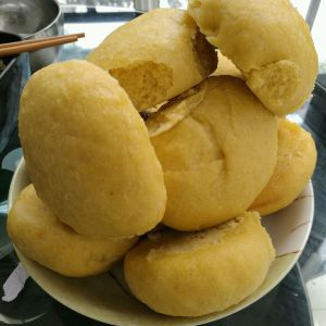 南瓜蒸熟捣烂,四分之一玉米面,四分之三面粉,和面,成型上锅蒸。