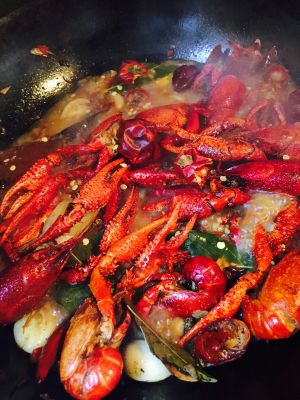 热锅凉油 放入葱姜蒜及以上所有调料 炒制 再加点红泡椒 出红油后放入炸好的龙虾