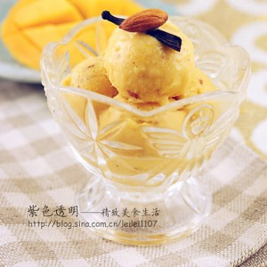 再放入冰箱冷冻,反复操作4.5次,我们就可以得到细化绵软的香草芒果冰淇淋了。