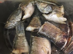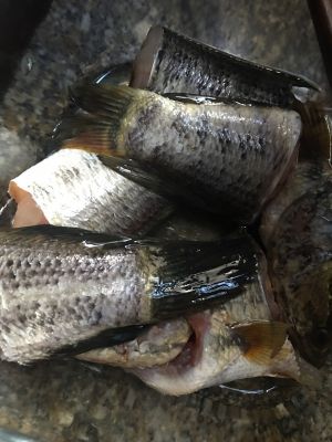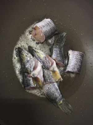 我用的两条稍小的鱼,肉比较嫩。先放一点盐腌制15-30分钟。然后用厨房纸巾吸干水份可以防油溅