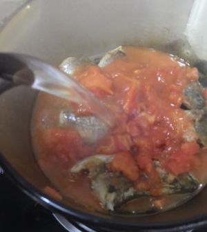 把番茄也倒入汤锅里,把刚刚煮的开水倒入汤锅里,这样的鱼汤就雪白雪白的了。煮开后调小火煮30分钟