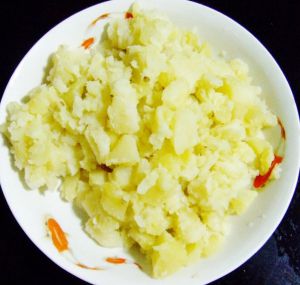 把煮熟的土豆碾成泥,放些胡萝卜细丁,放些生粉搅拌均匀
