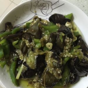 再下入青椒,继续翻炒,因为腌茄子的时候放了足够的盐,就没有再放盐,只放了一些生抽,大概两小勺,继续炒,然后放入蒜末,炒出蒜香,就可以出锅了
