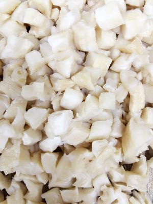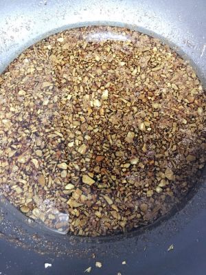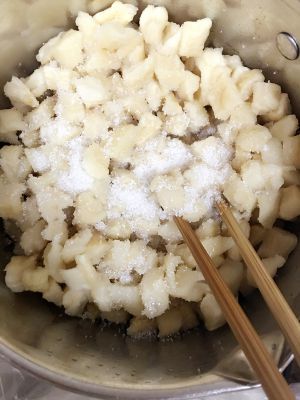 煮开水,淋到瓜脯里,迅速把瓜脯捞起来放入碗中,加入两勺白糖搅拌均匀,放凉