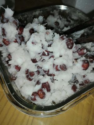 蒸好的山药去皮,要勺子压烂成泥,锅里倒白糖,量由个人喜欢,把沥干水的红豆倒进去不停搅拌,直到红豆表面有一层黏黏的糖