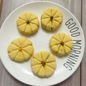 将馅放进南瓜面团中,按压成饼,用牙签压出纹路、南瓜饼get!葡萄干的是蜜豆南瓜饼,黄色芒果干的是黑芝麻馅。