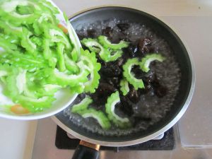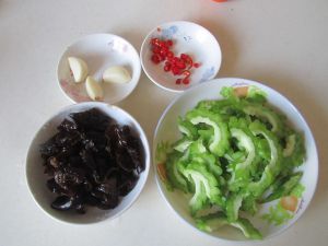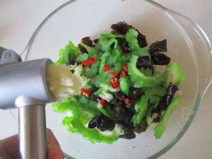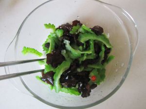 将黑木耳和苦瓜捞出沥干水分放入碗中后, 加入红辣椒, 再将大蒜压成蒜泥放入;