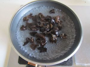 . 烧锅开水, 加入几滴油和适量盐, 将黑木耳放入里面焯煮一、两分钟;