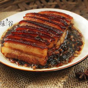 炒好的梅菜铺在码好的肉片上面,淋上刚才配好的酱汁 。