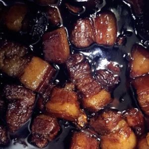冰糖融化后的样子。肉有点焦焦的,葱姜蒜块大,刚好出味儿,不会糊。