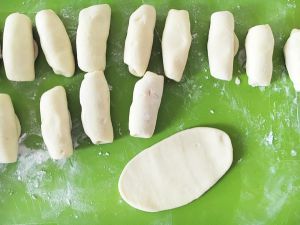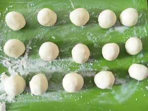 水油面团分成每个18克大小,油酥面团分成每个12克大小。