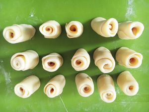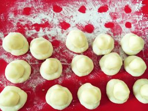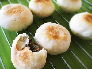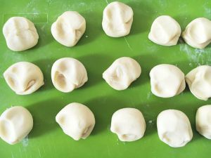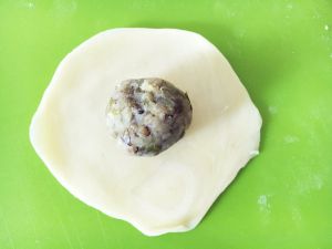 皮擀成圆形,要边缘薄中心厚一点,放入绿豆馅。