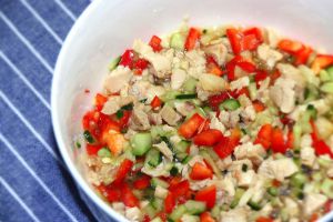 将调拌好的酸甜鸡肉红甜椒黄瓜丁放入