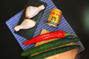 鸡腿、黄瓜、红椒洗净备用