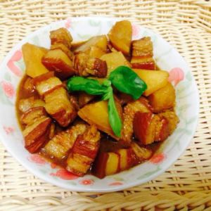 放老抽加热水没过肉放入葱姜蒜和八角,撇掉沫子小火炖30分钟