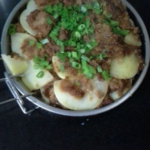 土豆切片沾上米粉铺满盘底,上面放上同样沾满米粉的五花肉片,摆好后上锅蒸40分钟。
