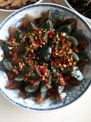 皮蛋三个,剥了壳冲洗下,对切在对切,皮蛋切好摆放在盘子里。把辣椒,姜,蒜,葱末,放入酱油,盐,鸡精调成汁,淋在皮蛋上就好。