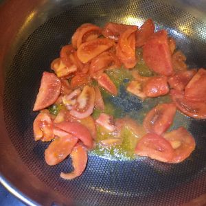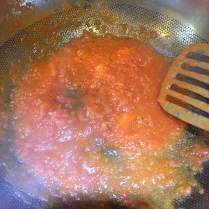 热锅倒油,加入西红柿中火翻炒出汁,要不停的翻炒