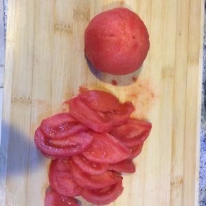 轻轻剥掉西红柿的皮,切片。