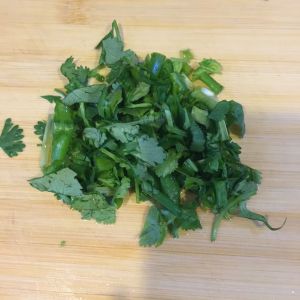 将香菜和香葱切碎,鸡蛋打入碗中,用打蛋器或者筷子打散!