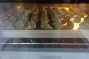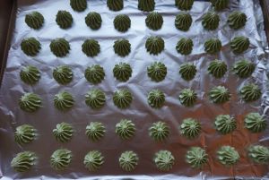 拌好的糊装入裱花袋,我用的大号曲奇星嘴。挤出花型,烤箱提前100度预热。
